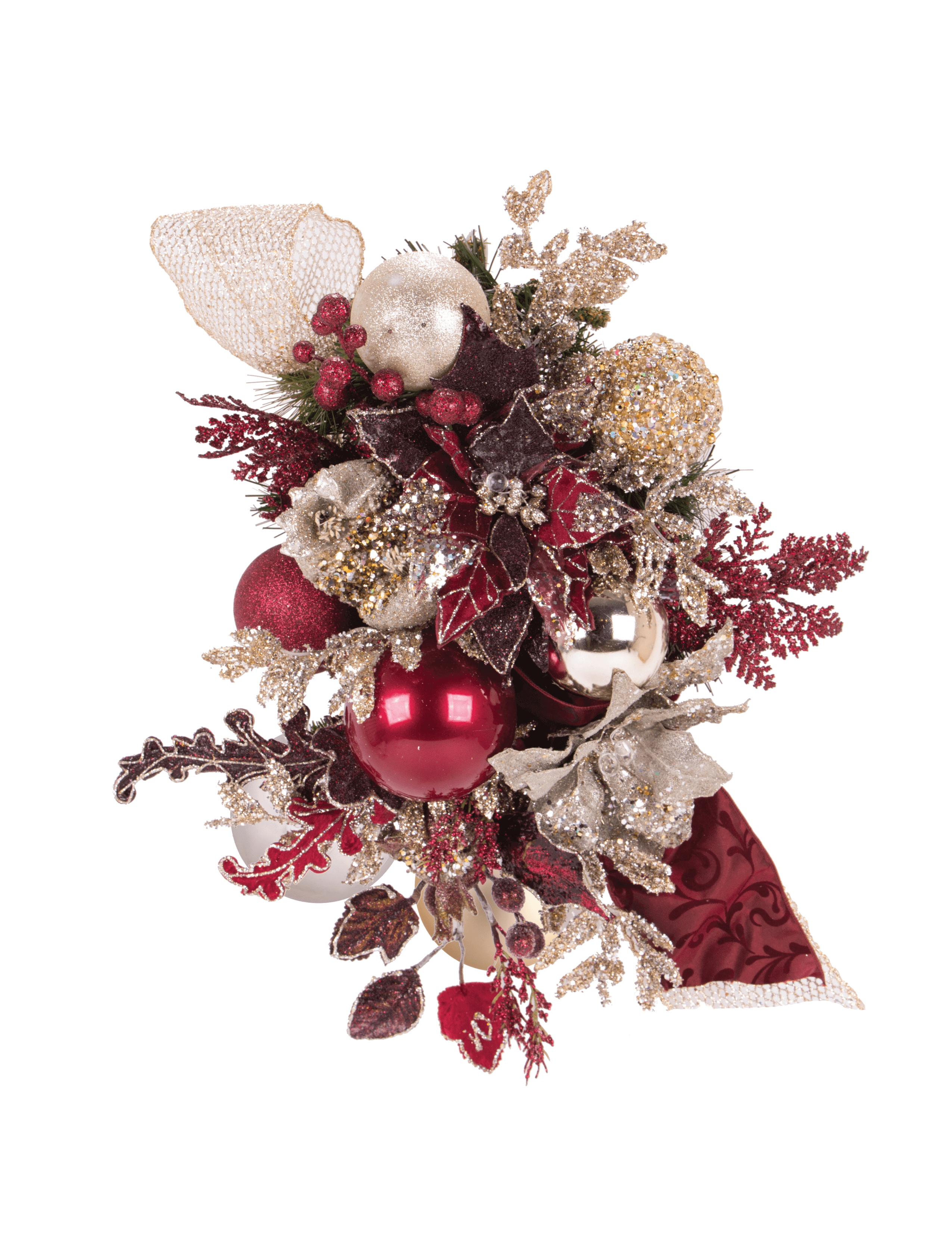 Burgundy and platinum beaded poinsettias are surrounded by gorgeous ornamentation, a touch of plush velvet ribbon finish off this rich look.