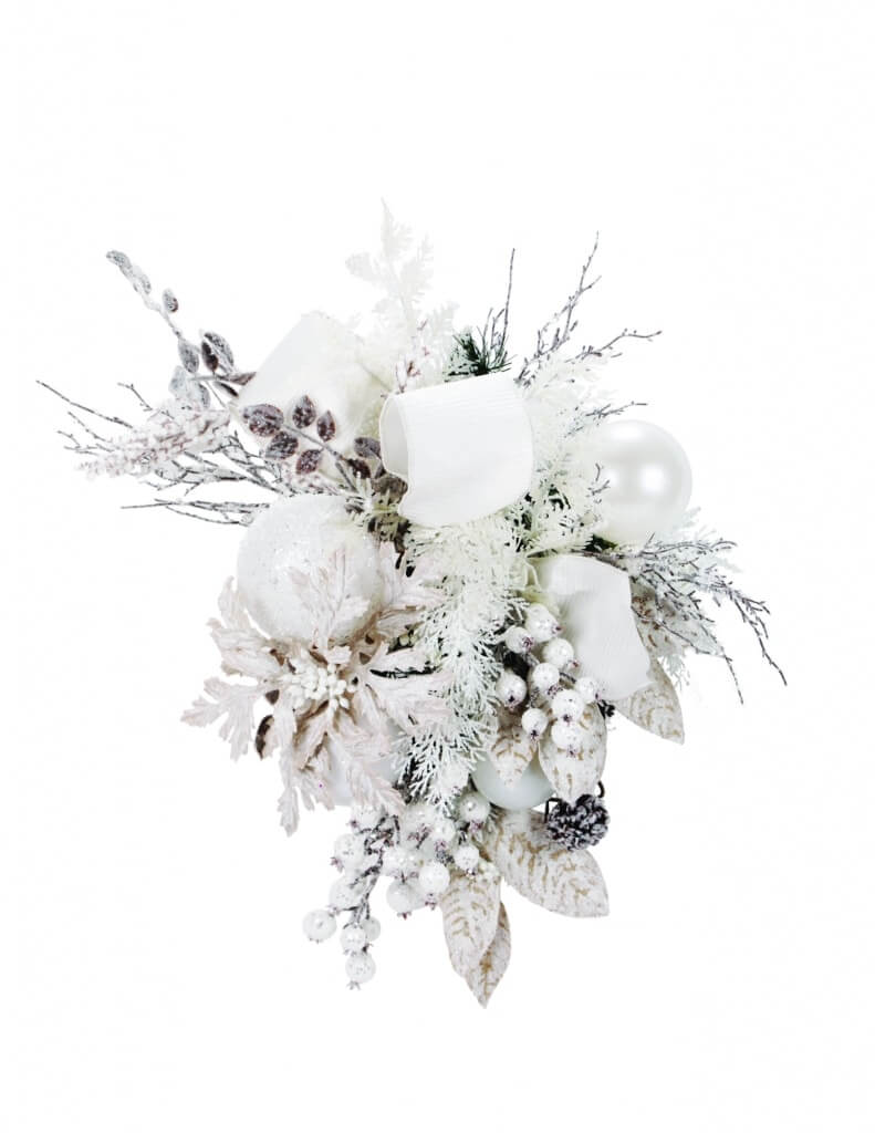 Opulent magnolias and poinsettias with their beading of crystals glisten against a background of the combination of metallic leaves and lavish ornamentation.