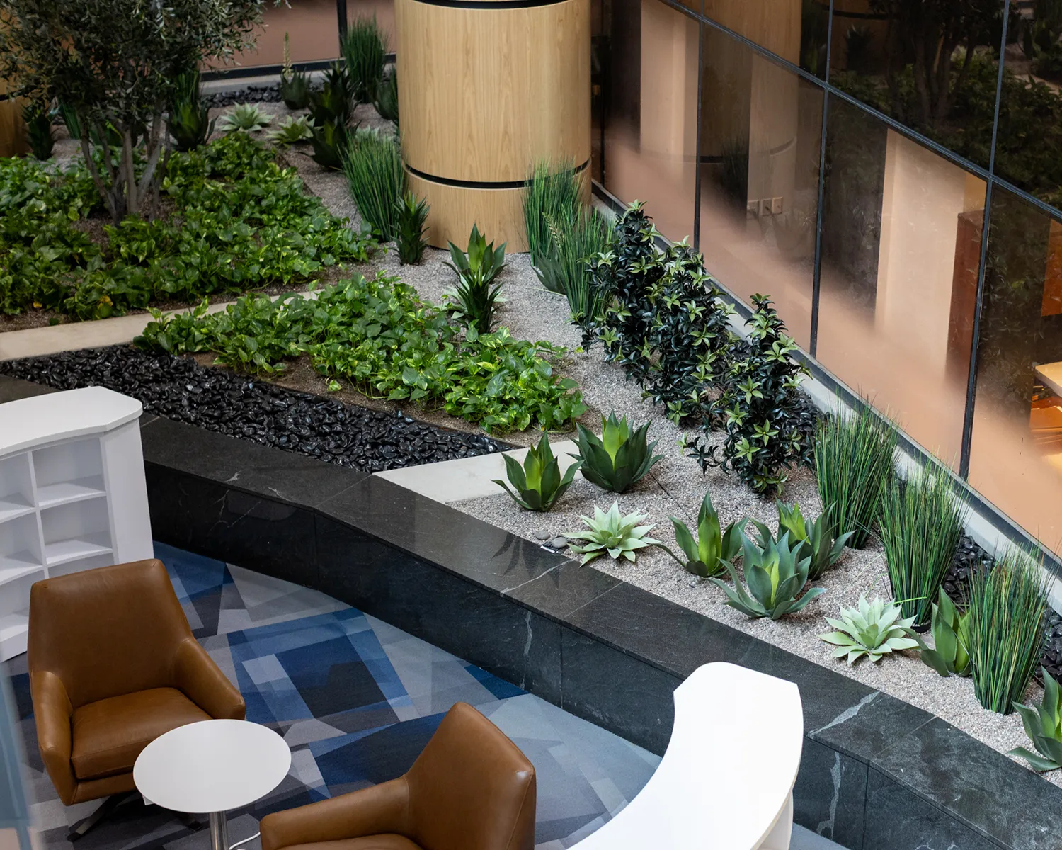 For smaller offices or single-room businesses, a few well-chosen rented container plants or a single MossWallArt™ piece can transform how a space feels. For larger commercial projects, such as corporate campuses, hotel lobbies, and healthcare facilities, interior landscaping can anchor the entire aesthetic of a space. Our article on interior landscapes in Arizona dives deeper into what works specifically in the desert Southwest.