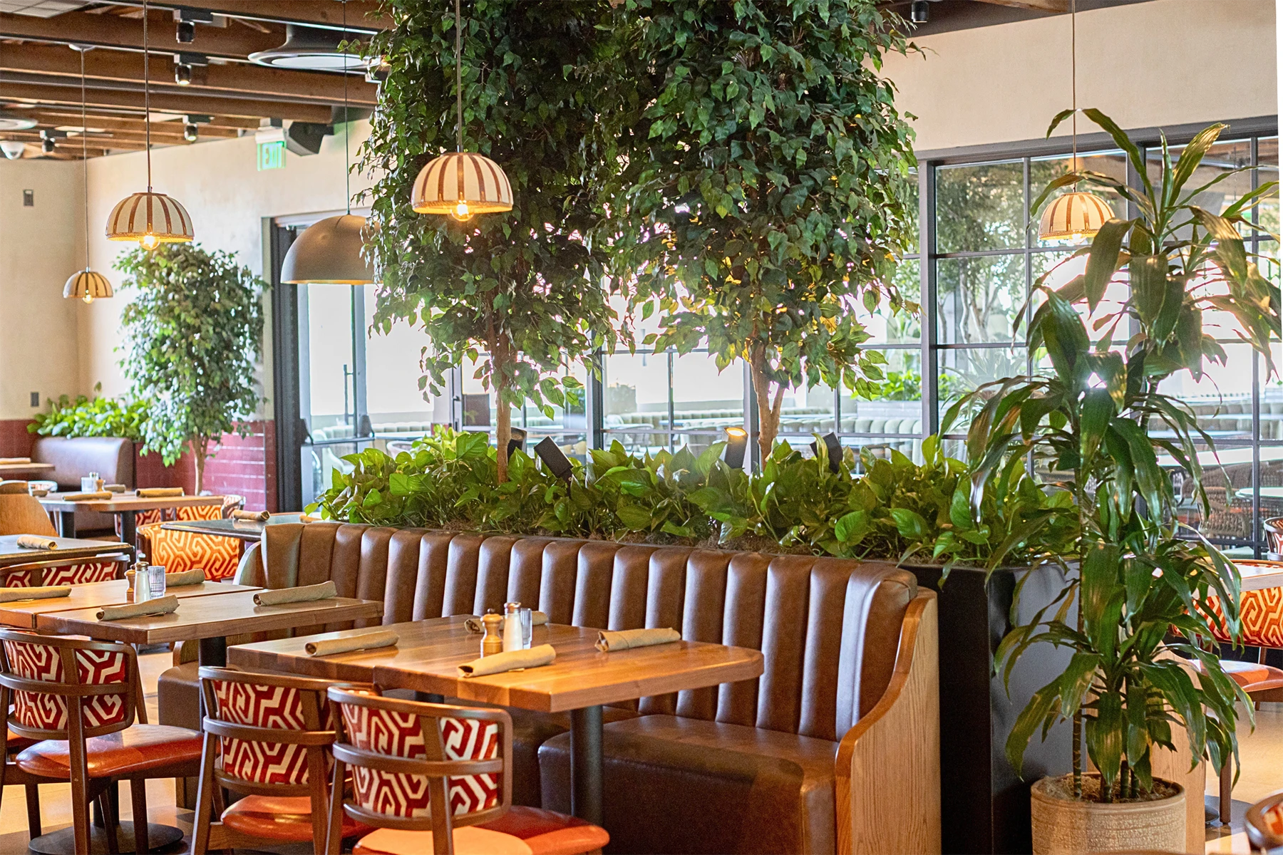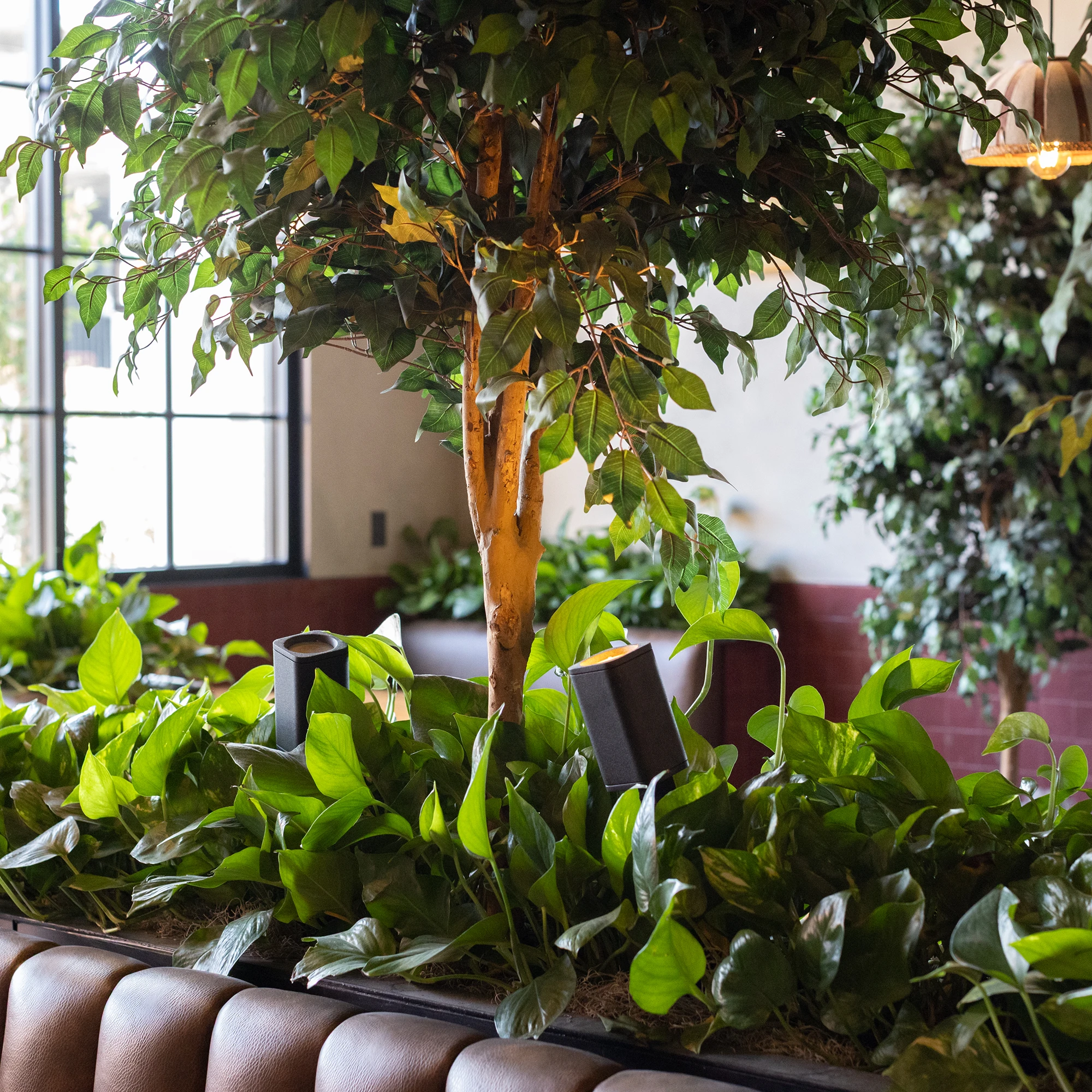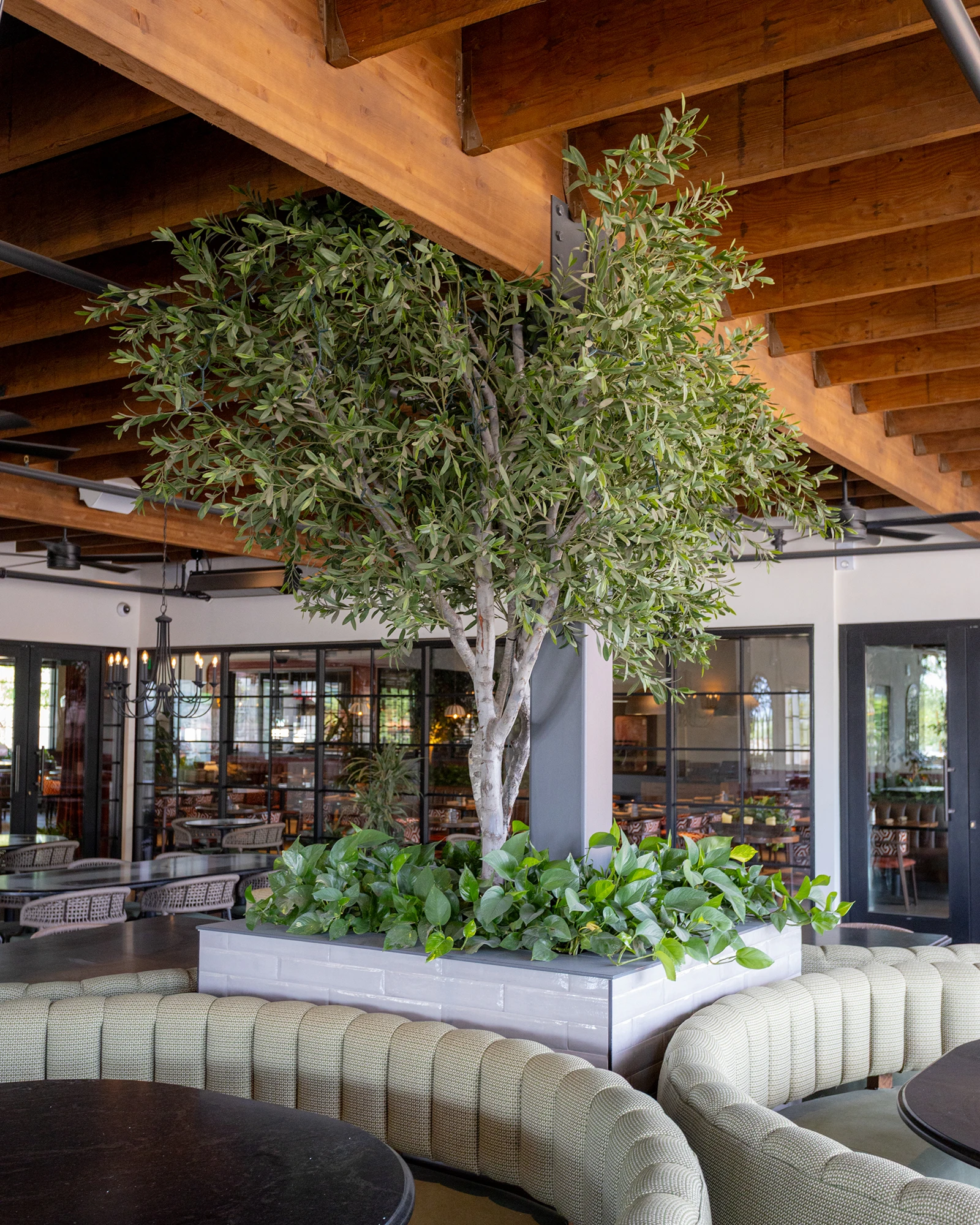 We placed lush tropical plants and booth-separating planters to shape the flow of the dining space. The focal point of the entire design features three handcrafted artificial olive trees, custom-built with real wood trunks to precise specifications. Their canopies were calibrated for height, spread, and balance—each surrounded by living plant base layers and dramatically uplit to create warmth, contrast, and visual depth. Every element was chosen to feel intentional but natural—evoking the comfort of a lived-in space while delivering the polish of a high-end hospitality concept.